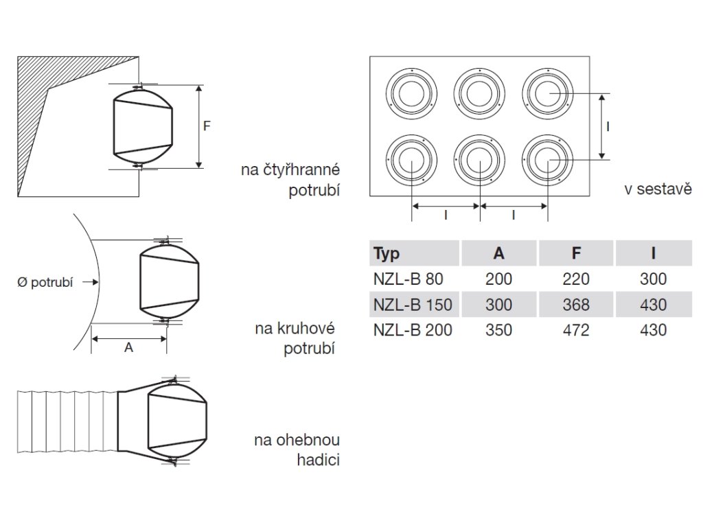 Dýzy jsou určeny pro montáž do stěny nebo do stropu pro přívod vzduchu. Doporučená výška instalace 2,4 – 11,5 m.