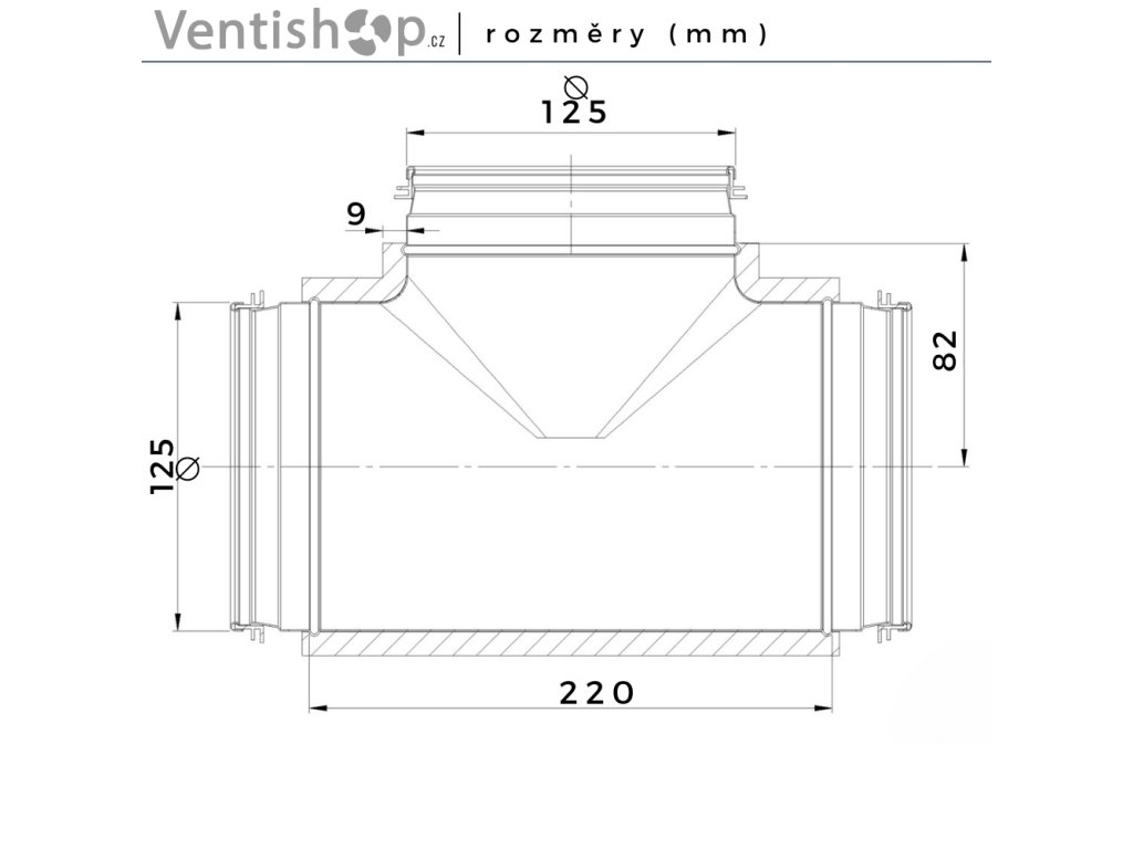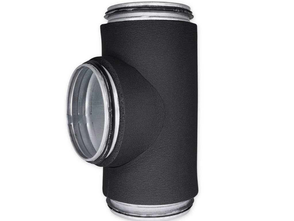 T-odbočka potrubí - ⌀ 125 mm (průměr), úhel 90°, předizolované, materiál pozink. ocel, materiál izolace (FEF elastomerová pěna), snadná instalace, požární bezpečnost třídy B, vzduchotěsnost třídy D, typ potrubí kruhové, provozní teplota -40 až +85 °C, tloušťka izolace 9 mm, splňuje směrnice (EN 12667, EN 13501-1), barva černá, rozměry 220 × 164 mm (Š×V), hmotnost 0,72 kg