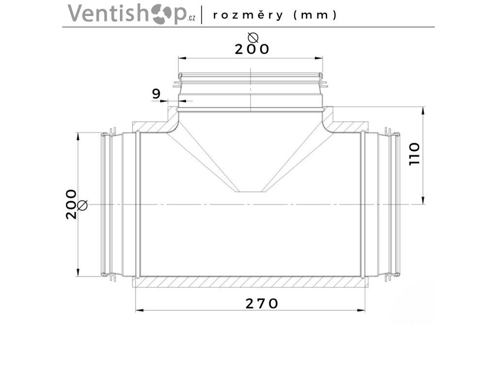 T-odbočka potrubí - ⌀ 200 mm (průměr), úhel 90°, předizolované, materiál pozink. ocel, materiál izolace (FEF elastomerová pěna), snadná instalace, požární bezpečnost třídy B, vzduchotěsnost třídy D, typ potrubí kruhové, provozní teplota -40 až +85 °C, tloušťka izolace 9 mm, splňuje směrnice (EN 12667, EN 13501-1), barva černá, rozměry 270 × 220 mm (Š×V), hmotnost 1,13 kg
