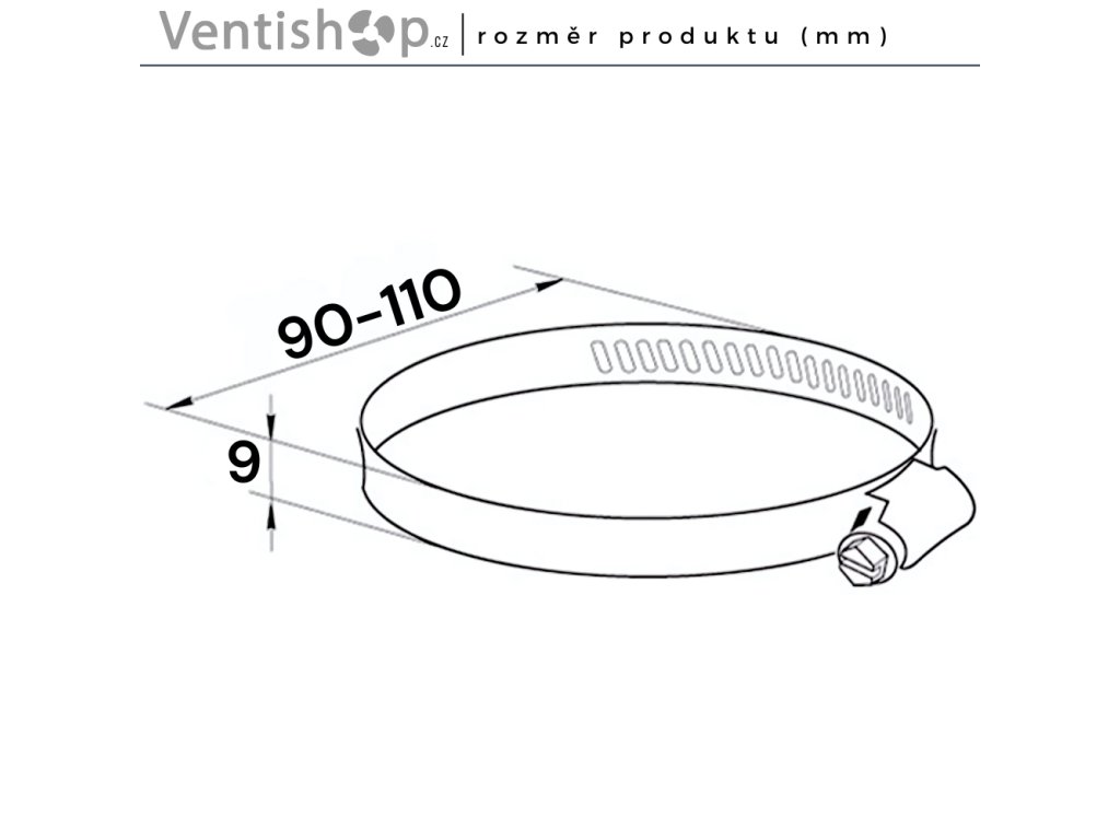 Stahovací pásek / spona - vhodné pro ⌀ 100 mm (průměr potrubí), materiál pozink. ocel, barva černá (RAL 9005), šířka 9 mm, pracovní teplota -30 °C až +100 °C, rozpětí ⌀ 90-110 mm, hmotnost ~ 0,2 kg