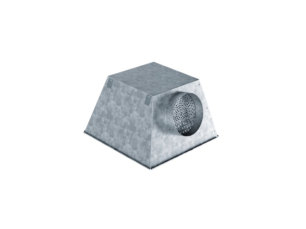 Plenum boxy pro vířivé anemostaty s připojením na čtvercovou čelní desku. Tvar komolého čtyřbokého jehlanu plenum boxů umožňuje stohování a tím lze uspořit místo při dopravě.