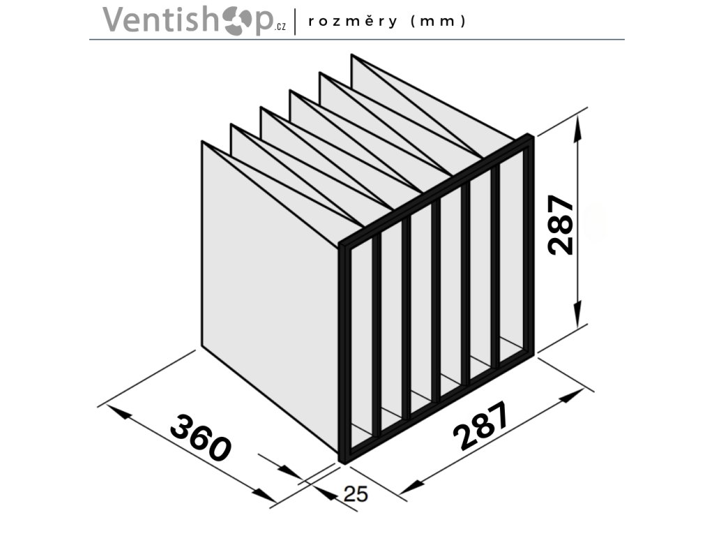 Přefiltr pro ventilační / klimatizační systém - stupeň filtrace G4 (ISO Coarse 60%), šířka 287 mm, výška 287 mm, hloubka 360 mm, plocha filtru 0,7 m², testováno dle normy ISO 16890, vyhovuje VDI 6022, netkaná vlánka (svařovaná), rychlá montáž a snadná výměna, upevnění (do filtračních stěn SIF / univerzálních skříní UCA), materiál rámu plast, rozměry 287 × 287 mm (Š×V), hmotnost 0,3 kg