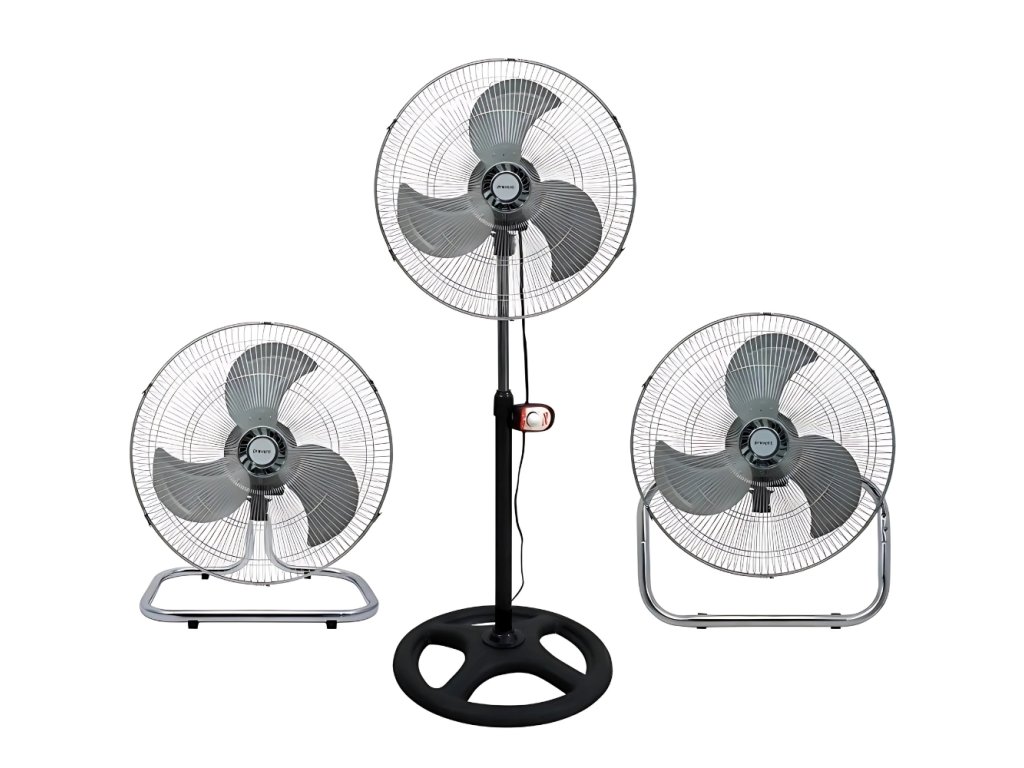 Výkonný axiální ventilátor - příkon 55 W, 3v1 (stojanový, podlahový, nástěnný ventilátor), průměr vrtule 45 cm, max. výška 150 cm, tři rychlosti, automatická oscilace 90°, vrtule a pouzdro z oceli, tichý provoz, hmotnost ~ 4,87 kg
