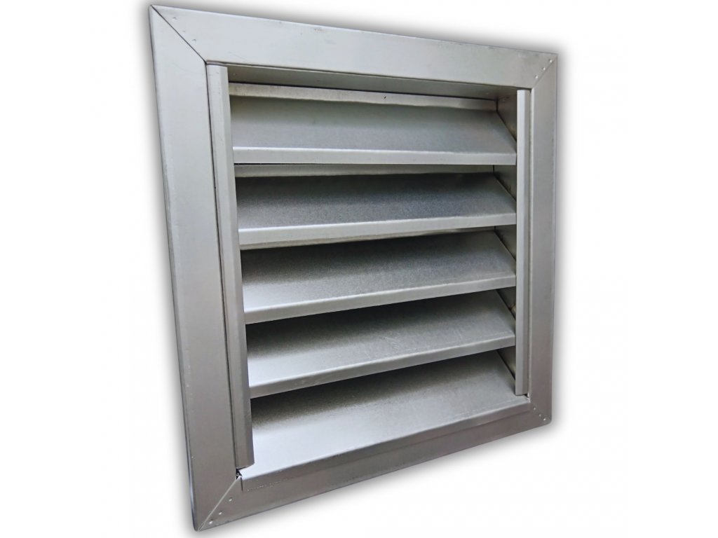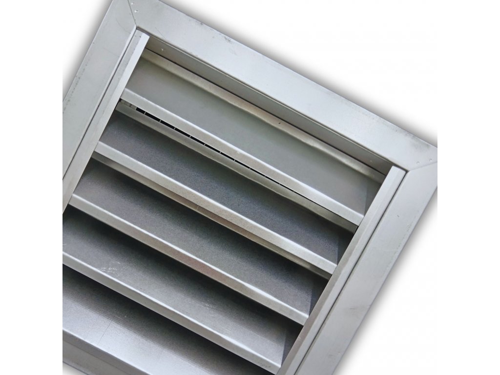 Protidešťová žaluzie - materiál pozinkovaný plech, hrubá síť, efektivní plocha sef 0,0638 m², snadno přizpůsobitelné díky možnosti lakování RAL, zakryje stavební otvory, užívané pro (obytné, kancelářské či průmyslové objekty), rozměry 355 × 355 mm (Š×V), hmotnost 3 kg