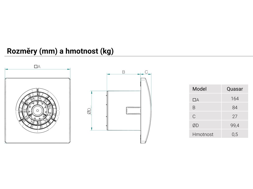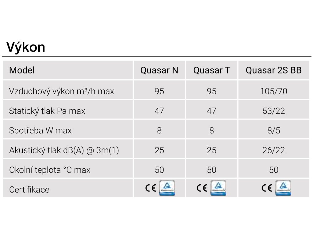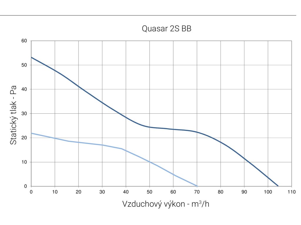 Diagonální konstrukce ventilátoru kombinuje to nejlepší z axiálních i radiálních ventilátorů. Vysoký průtok umožní bezproblémový odtah středně velkých i větších prostor, ventilátor však disponuje také pozoruhodnou vlastností tlaku. Oproti běžným axiálním ventilátorům tak QUASAR spojíte i se středně dlouhým potrubím.