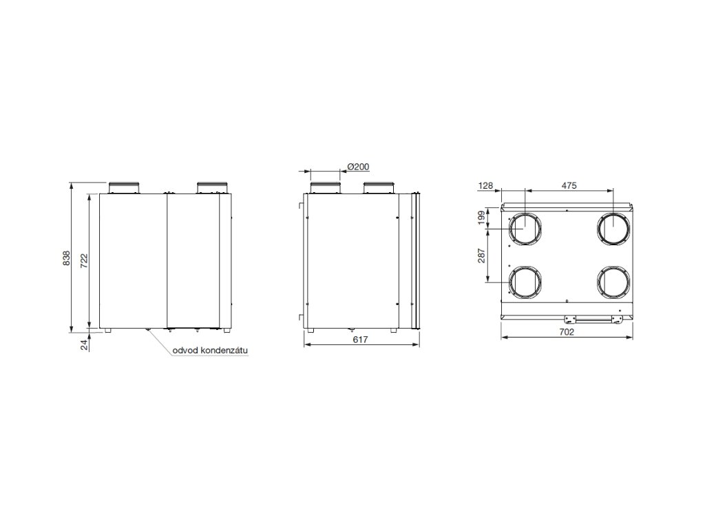 Skříň je vyrobena z vysoce kvalitního a odolného expandovaného pěnového polystyrenu s vnějším pláštěm z lakovaného ocelového plechu, což zajišťuje nízké tepelné ztráty jednotky. Na spodní straně je z jednotky vyveden odvod kondenzátu. Na skříni jsou umístěna hrdla o Ø 200 mm. Jednotka má integrovaný bypass. Na sání odpadního vzduchu a sání čerstvého vzduchu je větrací jednotka vybavena ventilátory s EC elektromotory. Jednotka je standardně osazena filtry třídy G4 (ISO COARSE > 65 %) ze syntetických vláken, volitelně je na sání čerstvého vzduchu možno dodat filtr F7 (ISO e PM1 > 65 %).