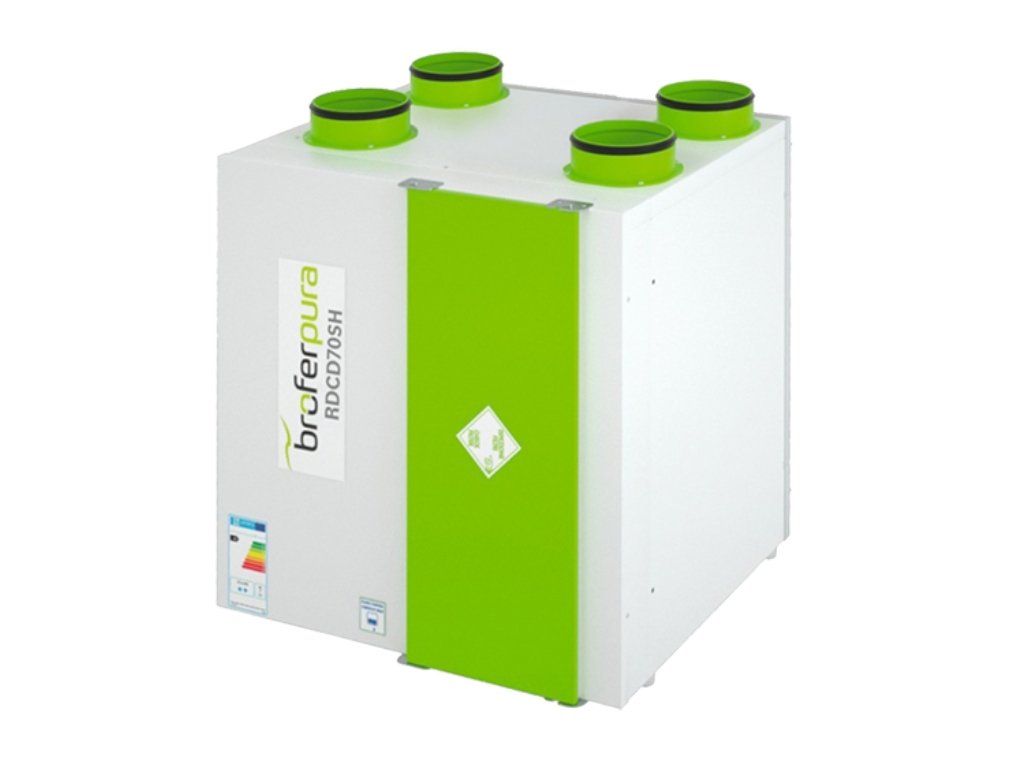 Centrální rekuperační jednotka s entalpickým výměníkem Brofer RDCD 70 SHE je vybavena protiproudým výměníkem s vysokou účinností zpětného získávání tepla až 93 %. Díky vysoké účinnosti rekuperace a ventilátorům s EC motory Vám RDCD ušetří náklady za vytápění a energie. Jednotka je standardně osazena filtry třídy G4 ze syntetických vláken. Jednotka je v provedení Plug & Play s integrovaným bypasem, dodávána včetně bezdrátového ovladače a je určena pro trvalý provoz.