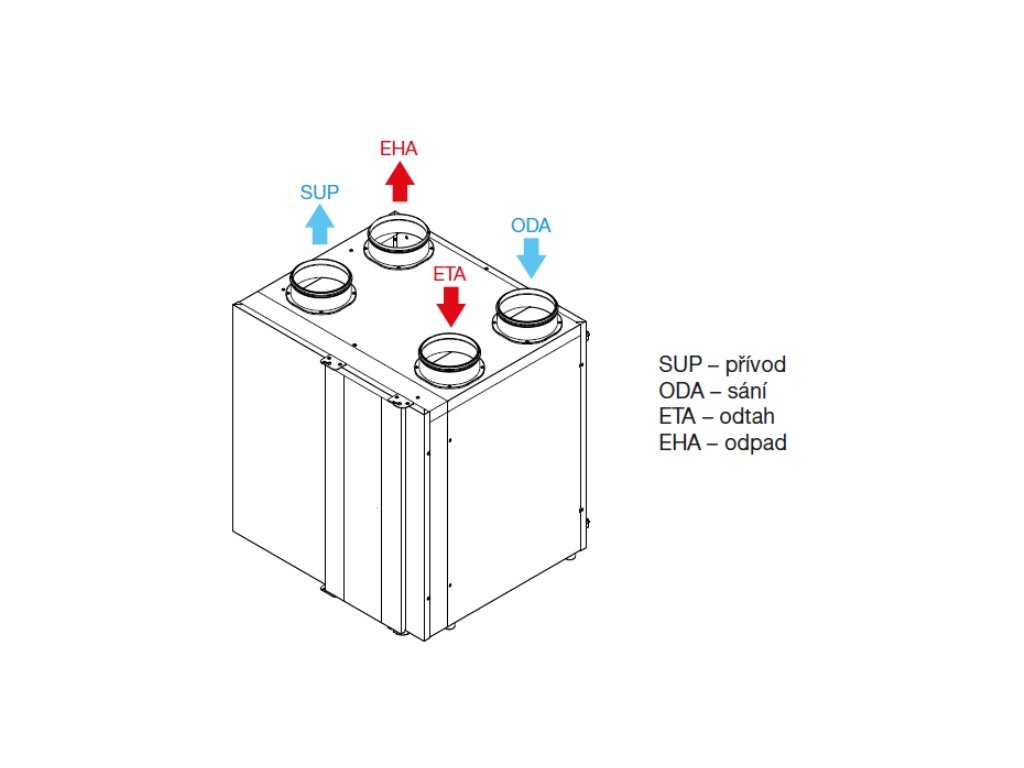 Skříň je vyrobena z vysoce kvalitního a odolného expandovaného pěnového polystyrenu s vnějším pláštěm z lakovaného ocelového plechu, což zajišťuje nízké tepelné ztráty jednotky. Na spodní straně je z jednotky vyveden odvod kondenzátu. Na skříni jsou umístěna hrdla o Ø 200 mm. Jednotka má integrovaný bypass. Na sání odpadního vzduchu a sání čerstvého vzduchu je větrací jednotka vybavena ventilátory s EC elektromotory. Jednotka je standardně osazena filtry třídy G4 (ISO COARSE > 65 %) ze syntetických vláken, volitelně je na sání čerstvého vzduchu možno dodat filtr F7 (ISO e PM1 > 65 %).
