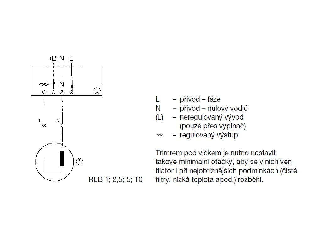 230 V/50 Hz provedení na omítku Jednofázový triakový regulátor se používá pro plynulou regulaci otáček ventilátoru a jako vypínač. Minimální otáčky ventilátoru lze nastavit po sejmutí krytu pootočením regulačního prvku. Krytí IP44, pracovní teplota 0–40 °C. POZOR Regulátor může způsobovat intenzivní parazitní hluk motoru, zvláště při nízkých otáčkách. Pak je nutno použít transformátorový regulátor.Doplňkové parametry