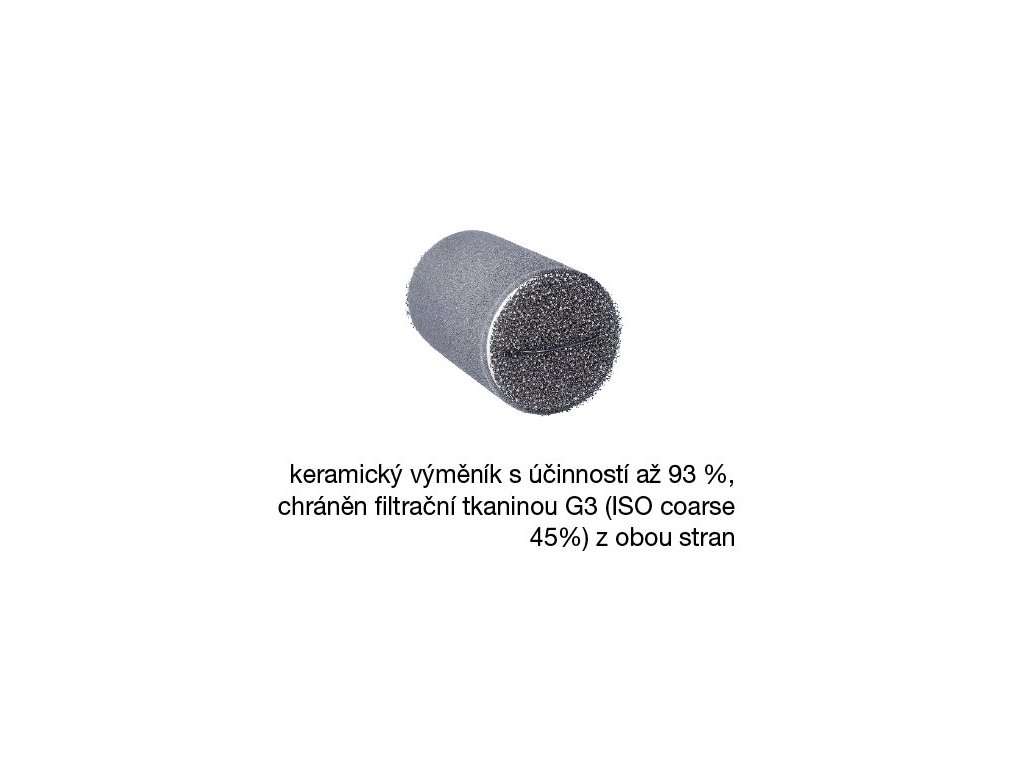 Lokální rekuperace - ⌀ 100 mm, dálkové ovládání, průtok 30 m³/h, vysoká účinnost 93 %, filtrace G3 (ISO Coarse 45%), 3 rychlostní stupně, účinný keramický výměník, renomovaný španělský výrobce, vhodné do (interiéru - koupelen, ložnic, obývacích pokojů, kuchyní), "režim střídání", příkon 7,5 W, hlučnost 29 db(A), napětí 230 V, rozměry 500 × 210 mm (Š×V), hmotnost 4,6 kg