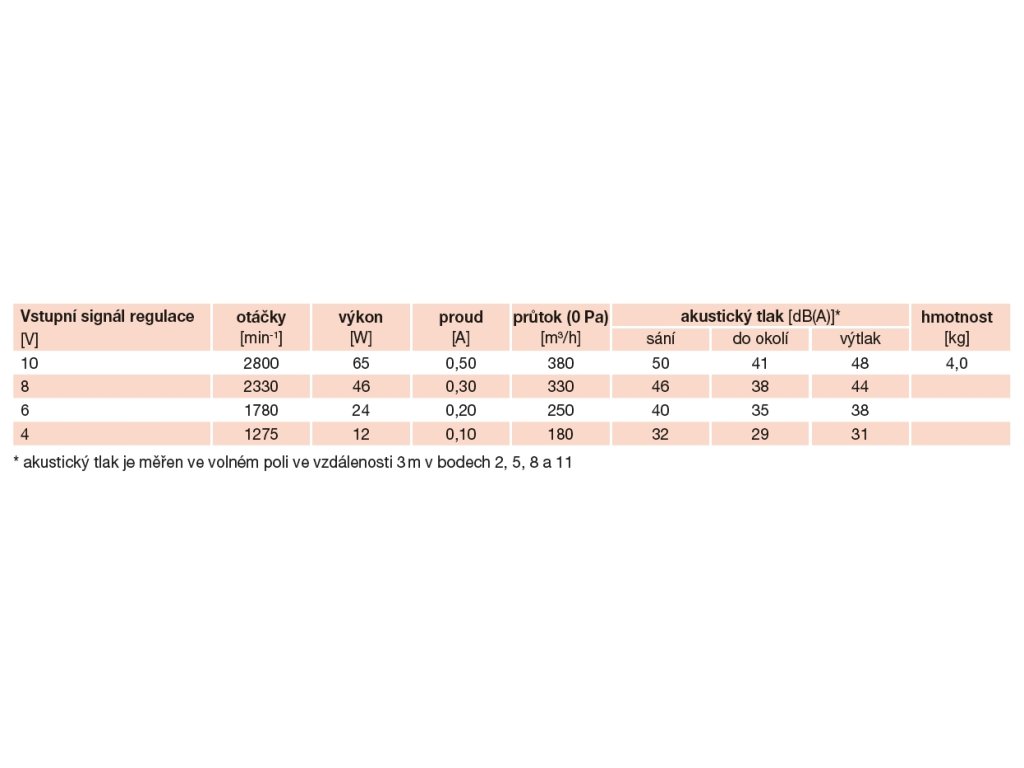 EC motor s tepelnou a elektronickou ochranou proti přetížení. Ložiska kuličková. Třída izolace B, krytí IP44. Pracovní teplota -20 °C až +40 °C.