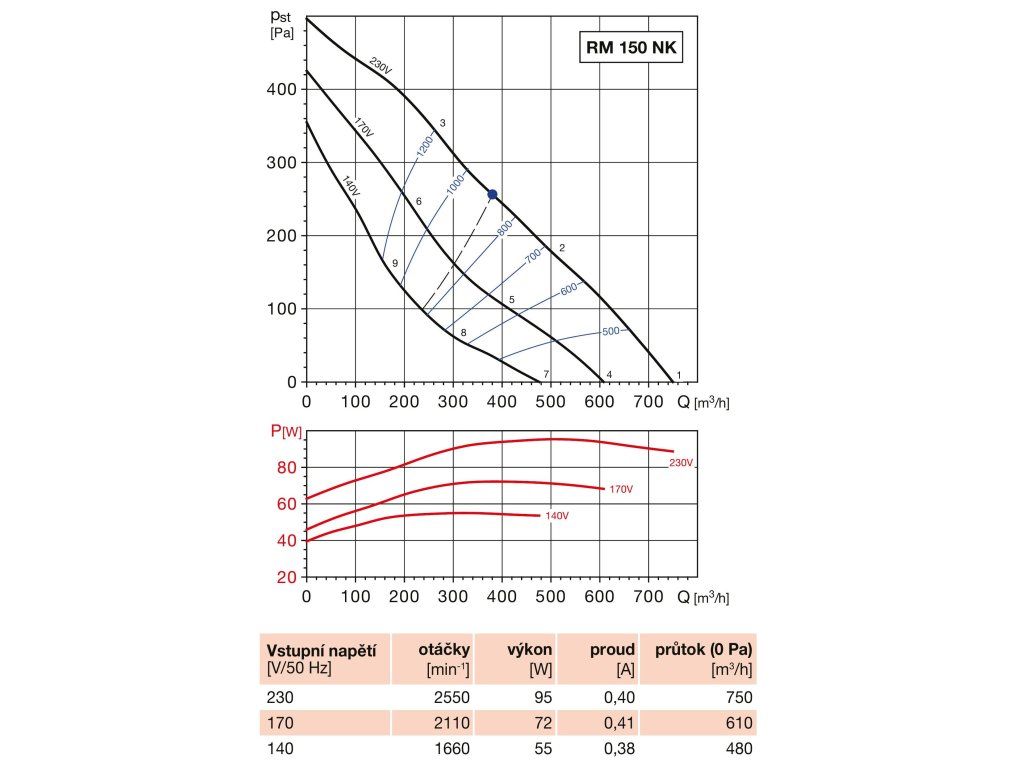 Ventilátor do potrubí - ⌀ 150 mm (průměr potrubí), radiální konstrukce, jednofázový motor 230 V / 50 Hz, kuličková ložiska, průtok vzduchu 750 m3/h, příkon 95 W, krytí IP 44, materiál konstrukce pozink. ocel, hlučnost 38/55/57 dB/A, proud 0,4 A, otáčky 2550/min, rozměry 190 × 332 mm (Š×V), hmotnost 5 kg