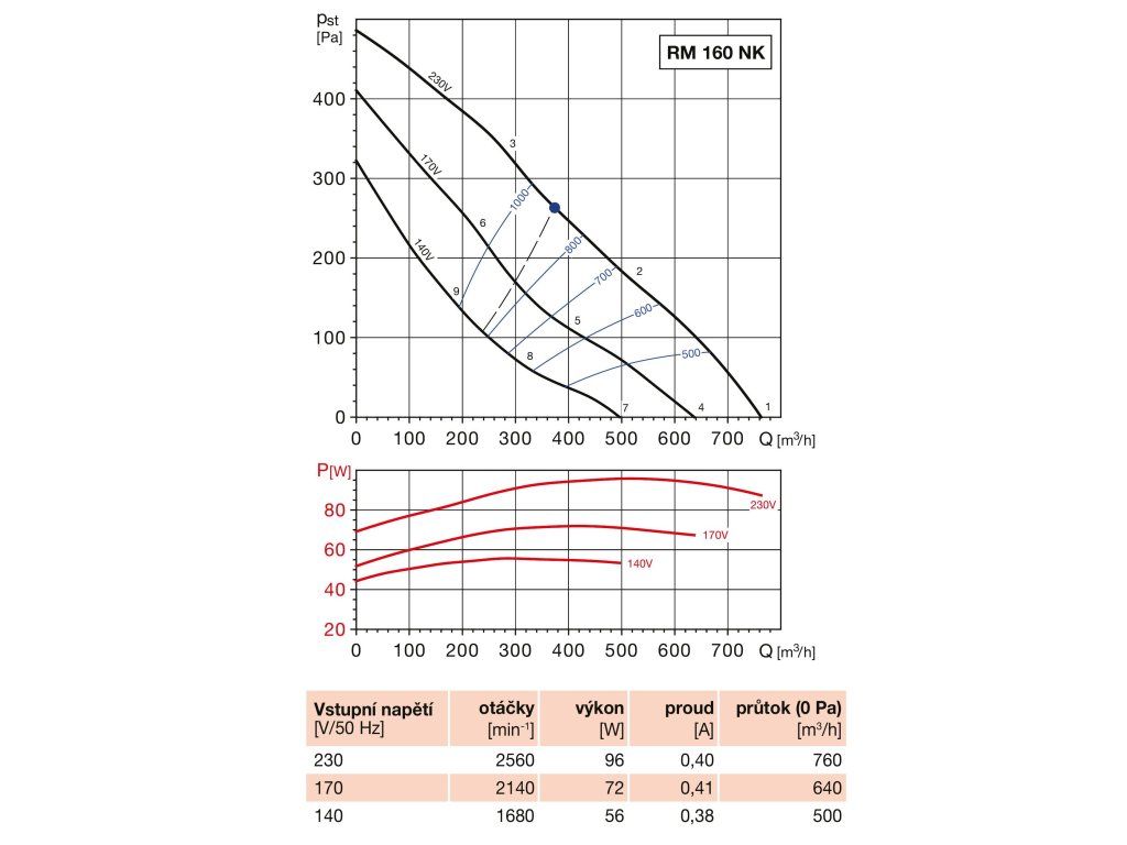 Ventilátor do potrubí - ⌀ 160 mm (průměr potrubí), radiální konstrukce, jednofázový motor 230 V / 50 Hz, kuličková ložiska, průtok vzduchu 760 m3/h, příkon 96 W, krytí IP 44, materiál konstrukce pozink. ocel, hlučnost 37/55/56 dB/A, proud 0,4 A, otáčky 2560/min, rozměry 190 × 332 mm (Š×V), hmotnost 5 kg