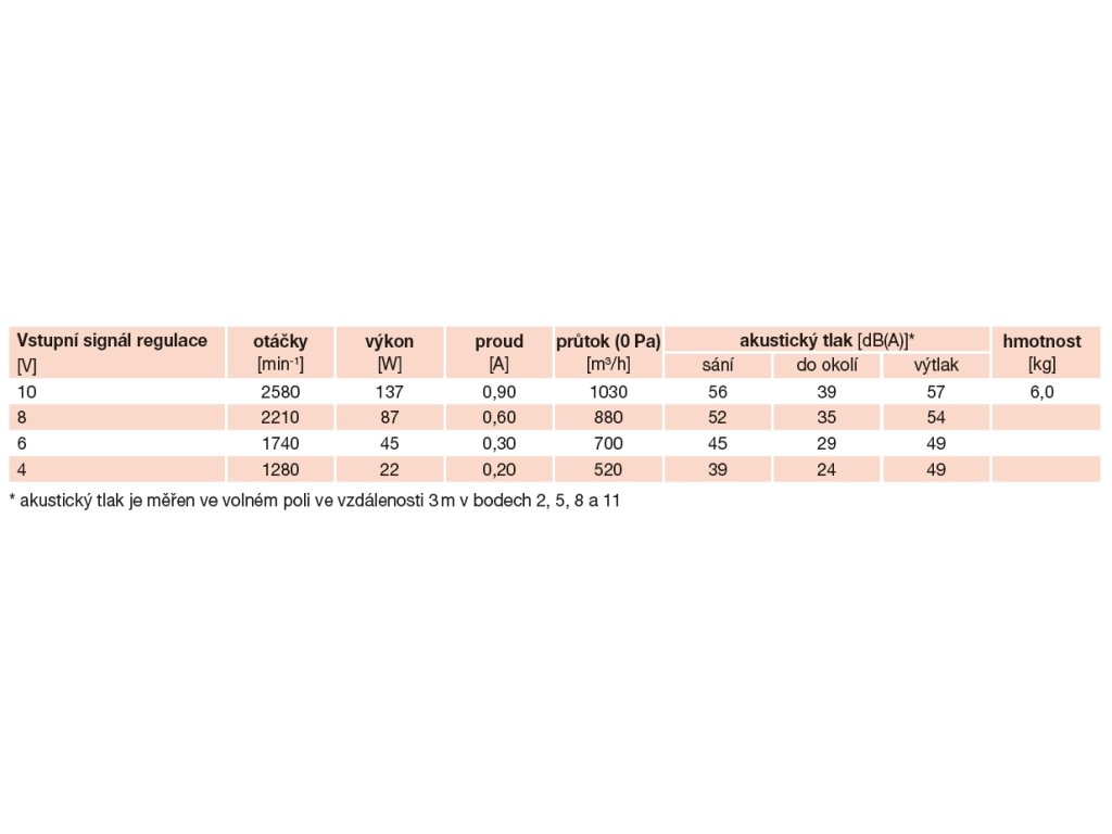 EC motor s tepelnou a elektronickou ochranou proti přetížení. Ložiska kuličková. Třída izolace B, krytí IP44. Pracovní teplota -20 °C až +40 °C.