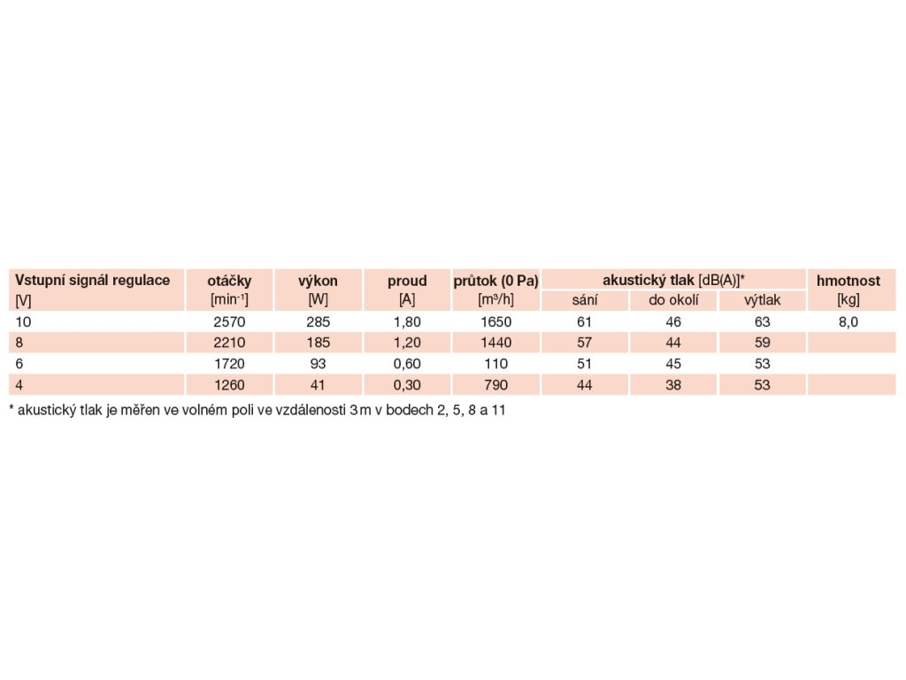 EC motor s tepelnou a elektronickou ochranou proti přetížení. Ložiska kuličková. Třída izolace B, krytí IP44. Pracovní teplota -20 °C až +40 °C.
