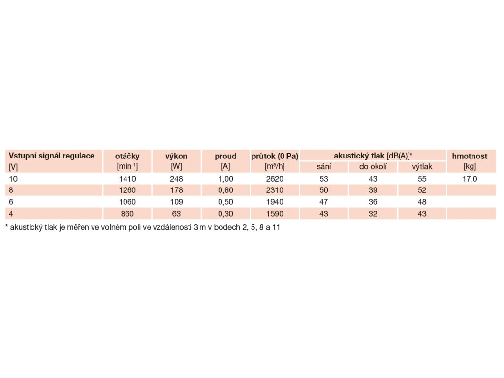 EC motor s tepelnou a elektronickou ochranou proti přetížení. Ložiska kuličková. Třída izolace B, krytí IP44. Pracovní teplota -20 °C až +40 °C.