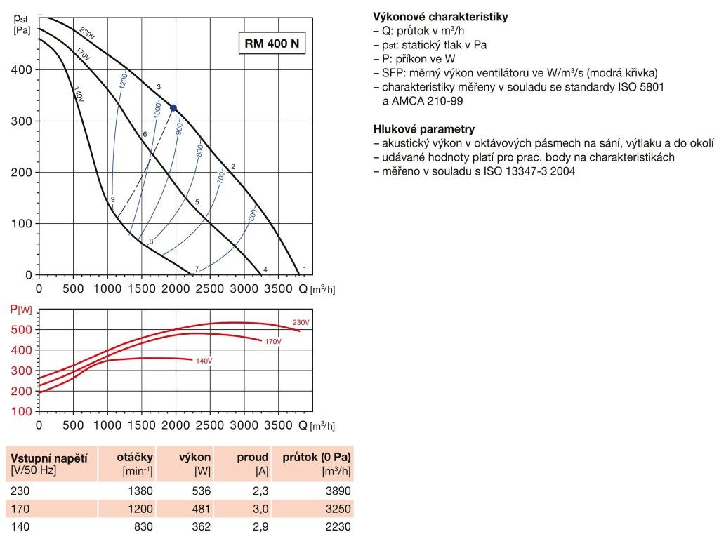 Ventilátor do potrubí - ⌀ 400 mm (průměr potrubí), radiální konstrukce, jednofázový motor 230 V / 50 Hz, kuličková ložiska, průtok vzduchu 3800 m3/h, příkon 534 W, krytí IP 54, materiál konstrukce pozink. ocel, hlučnost 44/55/58 dB/A, proud 2,3 A, otáčky 1380/min, rozměry 431 × 568 mm (Š×V), hmotnost 22,2 kg