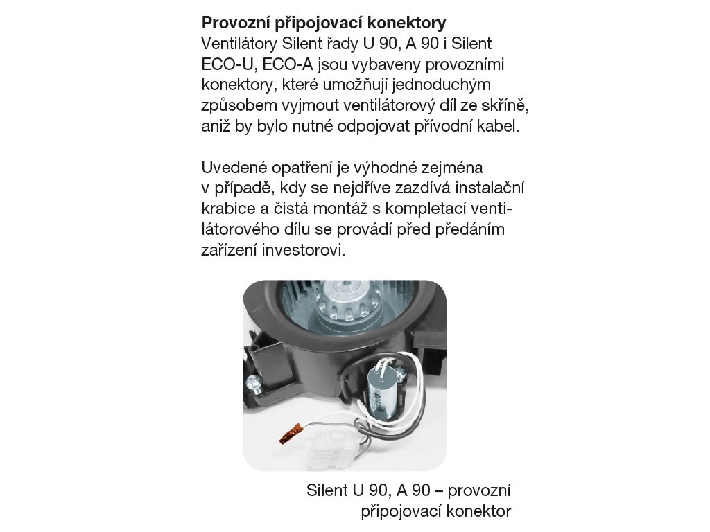 Ventilátory Silent jsou vybaveny provozními konektory, které umožňují jednoduchým způsobem vyjmout ventilátorový díl ze skříně, aniž by bylo nutné odpojovat přívodní kabel. Uvedené opatření je výhodné zejména v případě, kdy se nejdříve zazdívá instalační krabice a čistá montáž s kompletací ventilátorového dílu se provádí před předáním zařízení investorovi.