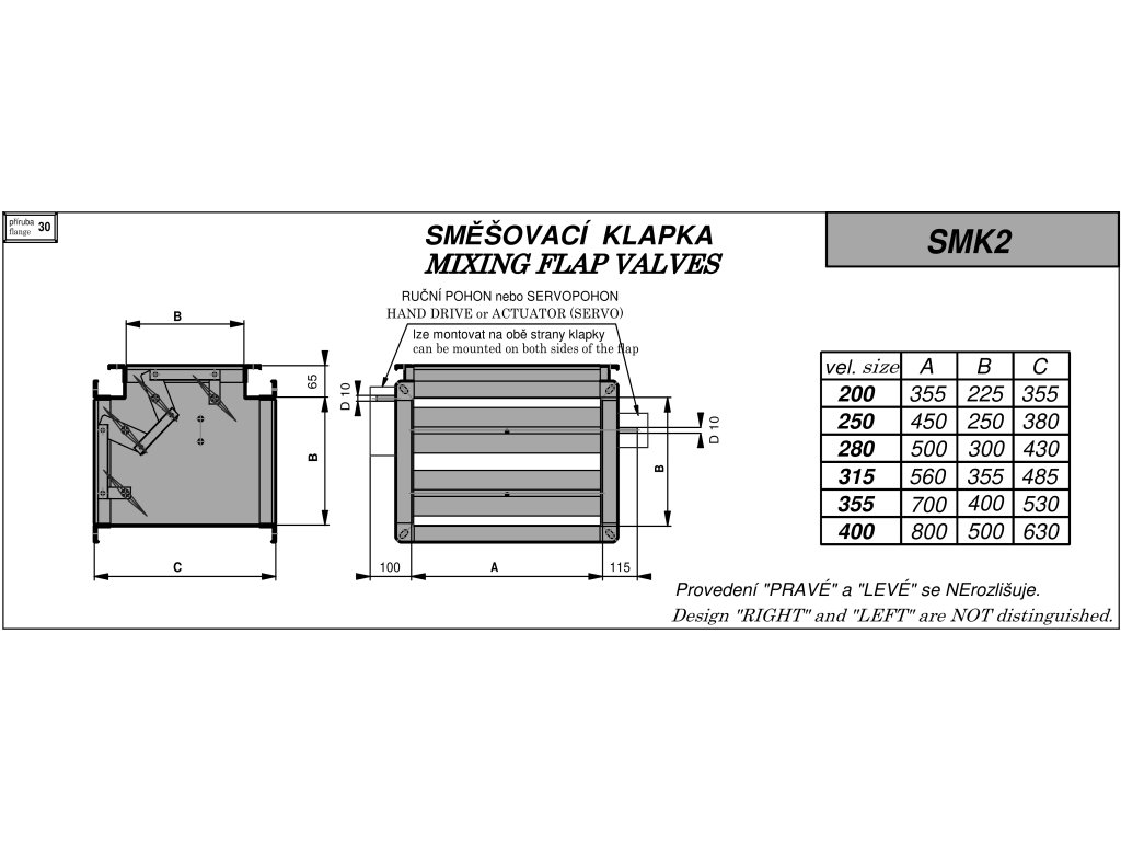 Ovládání lze montovat na libovolnou stranu klapky. Pro použití klapek v součinnosti s řídícími systémy REGU EASY a REGU ADi se standardně používají klapky s ovládacím napětím 24V (u EASY spojité a u REGU ADi tříbodové ovládání servopohonů). Při použítí řídícího systému REGAL se standardně používají klapky s ovládacím napětím 230V (servopohony s tříbodovým ovládáním). Pro regulaci směšování v závislosti na nastavené teplotě je dodáván regulátor SKR 10 nebo SKR 15 a potrubní čidlo ATC 10-V-…. Pro použití klapek v součinnosti s regulátorem SKR 10 nebo SKR 15 je nutno použít klapky se servopohony LM24A-SR nebo NM24A-SR.