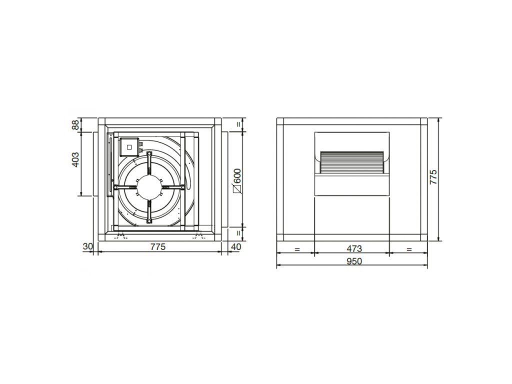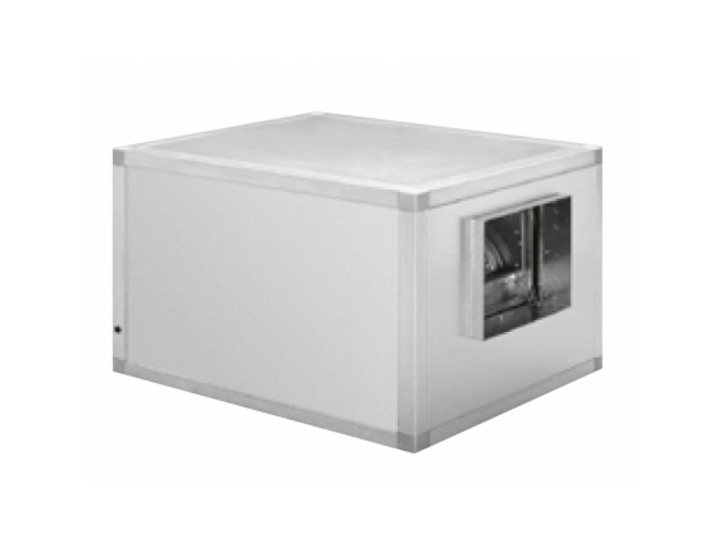 - Skříň je z ocelového, galvanicky pozinkovaného plechu. Skříň je uvnitř opatřena 7 mm vrstvou zvukově izolujícího materiálu. Ventilátor je uložen ve skříni na odpružených profilech, aby se omezil přenos vibrací. Na skříni jsou přišroubována kruhová hrdla pro připojení flexibilních hadic nebo kruhového potrubí. Při provozu ventilátoru je skříň v podtlaku.