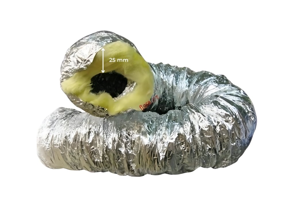 Odhlučněná hadice - ⌀ 125 mm (průměr), se zvukovou izolací, délka balení 10 m, tloušťka minerální vaty 25 mm, max. rychlost vzduchu 30 m/s, plní funkci tepelné izolace, teplotní odolnost (-30° až +140 °C), maximální tlak 2000 Pa, s výztuhou, tloušťka hliníkové vrstvy 0,045 mm, stlačeno na cca. 110 cm, perforována jako tlumič hluku, rozměry 10 000 × 125 mm (Š×V), hmotnost 4 kg