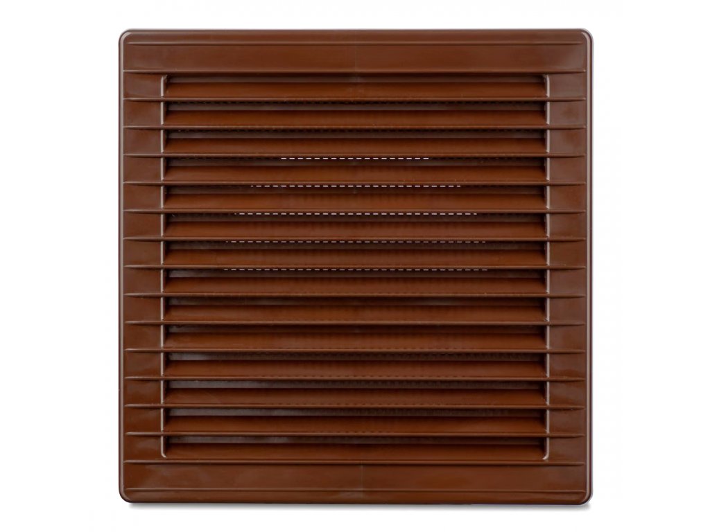 Plastová mřížka hnědé barvy s nastavitelnou přírubou. Výška, šířka 170 mm, vhodná pro potrubí o průměru v rozmezí 80-150 mm. Obsahuje zábranu proti hmyzu. Protidešťová žaluzie je navržena tak, aby se po vypnutí ventilátoru uzavřela, tím zabrání vniknutí nečistot, hmyzu nebo vody. Díky této funkcionalitě je vhodná pro širokou řadu využití v exteriéru.