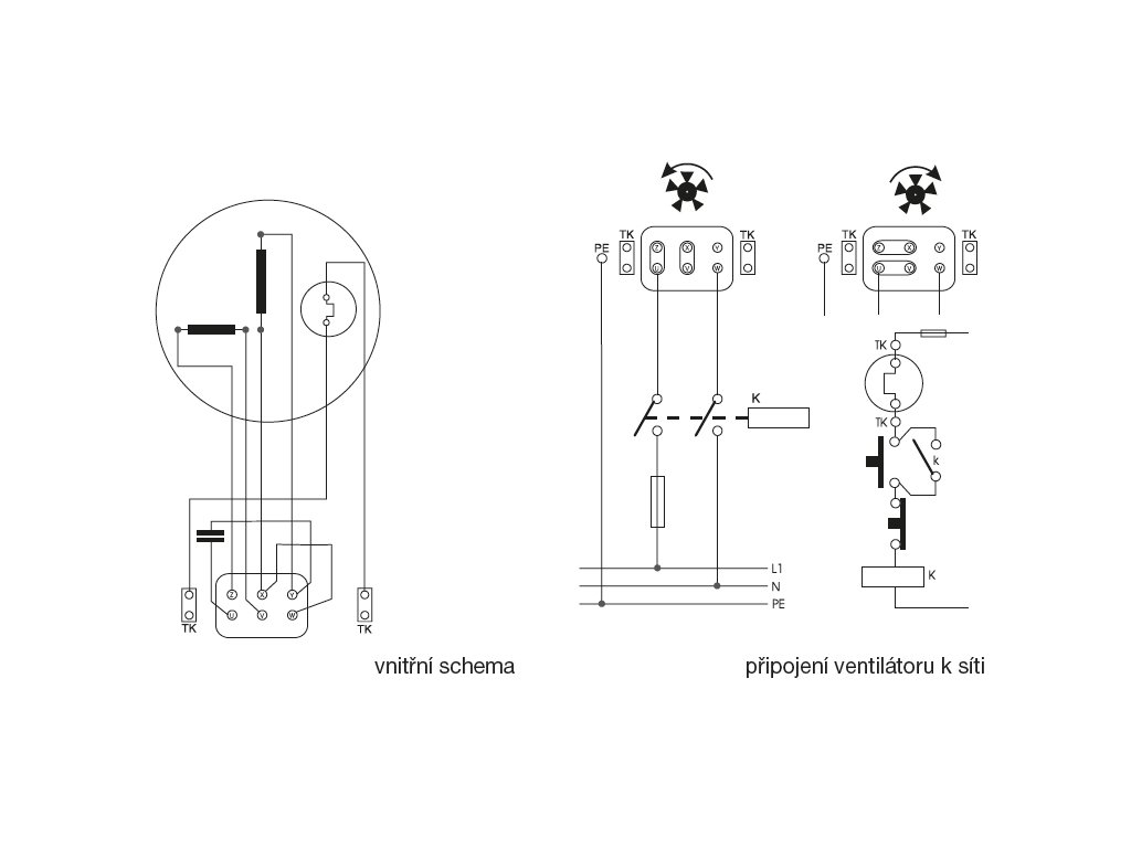Svorkovnice je standardně z černého plastu. U jednofázového provedení obsahuje také rozběhový kondenzátor. Svorkovnice je umístěna na skříni (potrubní provedení).