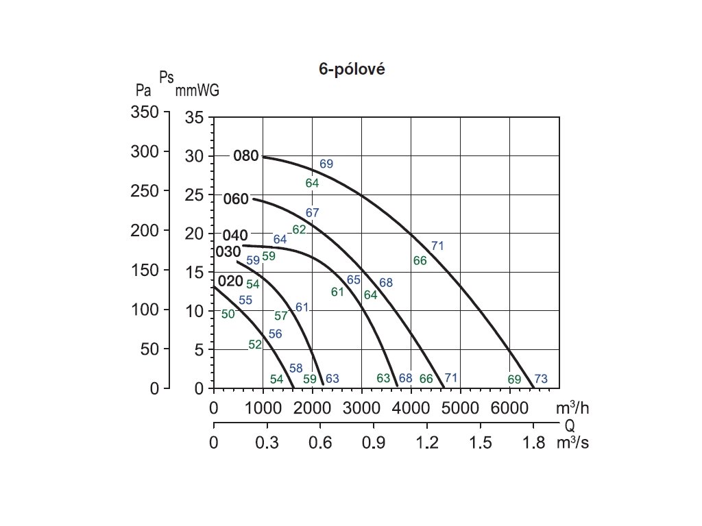 Hluk emitovaný ventilátorem je uveden v tabulce ve výkonových charakteristikách ventilátoru. Hodnoty jsou měřeny ve vzdálenosti 1,5 m na straně sání (zeleně) i výtlaku (modře).