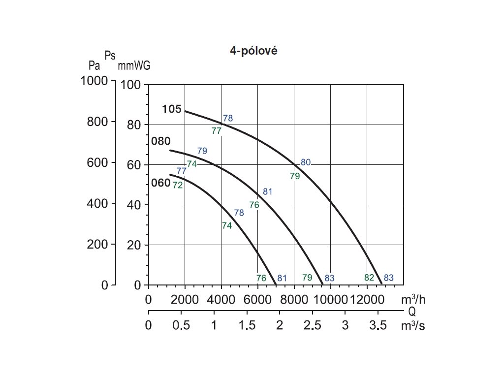 Hluk emitovaný ventilátorem je uveden v tabulce ve výkonových charakteristikách ventilátoru. Hodnoty jsou měřeny ve vzdálenosti 1,5 m na straně sání (zeleně) i výtlaku (modře).