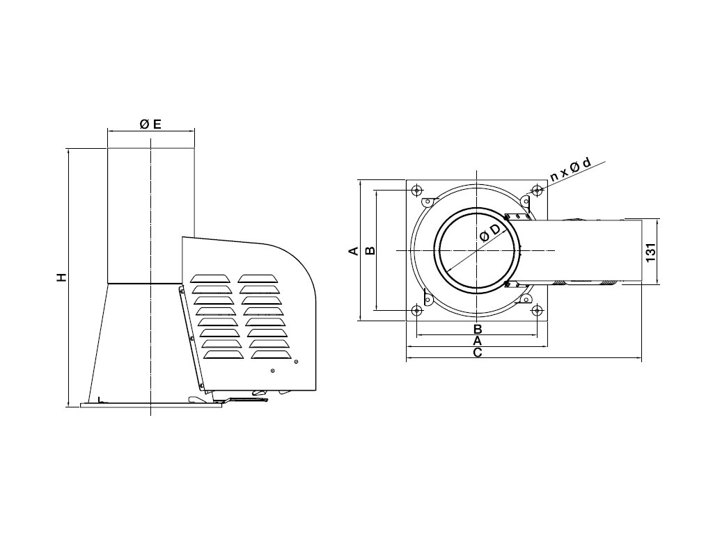 Skříň je z nerezového plechu. Na skříni je připevněna nerezová čtyřhranná příruba pro připojení na komínový průduch. Ventilátor je určen pro instalaci do venkovního prostředí.
