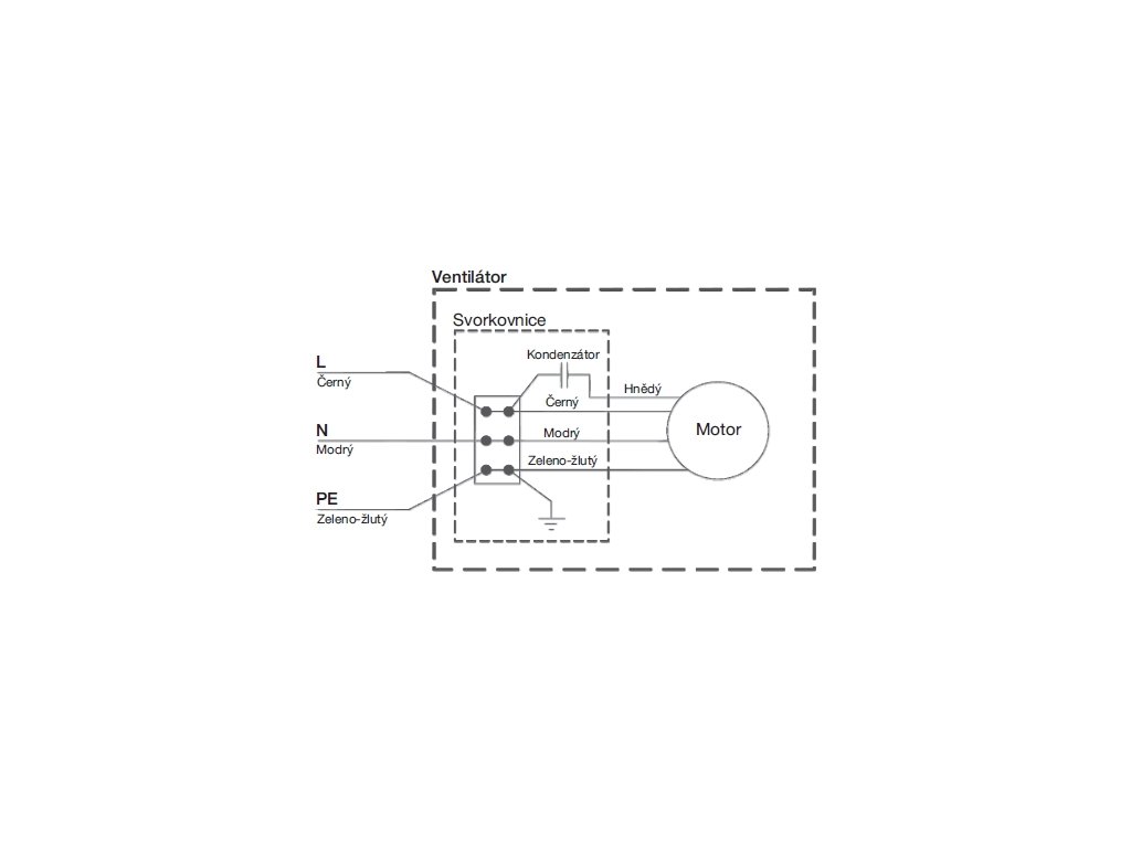 El. připojení kabelem ke svorkovnici ventilátoru. Ventilátor je určen pro pevnou montáž. Napájecí napětí 230 V / 50 Hz.