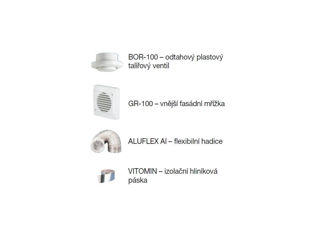 Montážní set TD 250/100 T KIT. Obsahuje ventilátor TD 250/100 T, 4 m hadici Aluflex Al 102 mm, odtahový plastový talířový ventil BOR-100, vnější fasádní mřížku GR-100, izol. hliníkovou pásku VITOMIN.Informace
