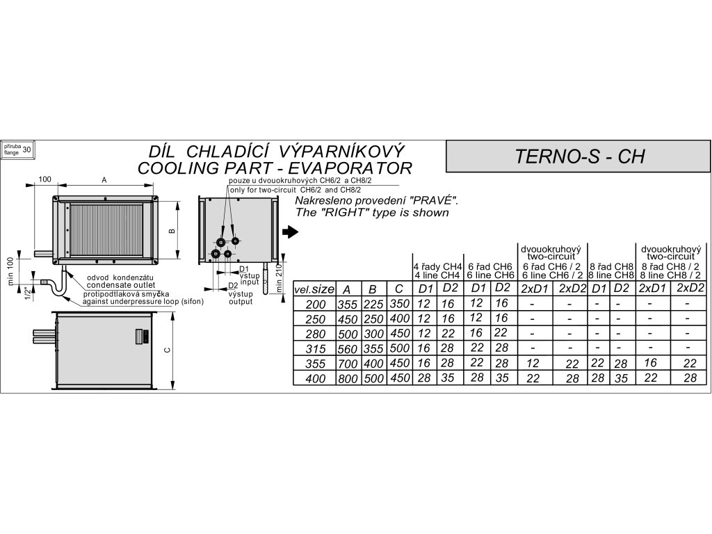 Jednotka s výparníkem smí být instalována pouze ve vodorovné poloze s odvodem kondenzátu ve spodní části komory! Dodávají se v provedení pravém či levém. Na odvod kondenzátu musí být připojena protipodtlaková smyčka, která je součástí dodávky. Lze zapojit také jako kondenzátor tepelného čerpadla při teplotě kondenzace 60°C a max. kondenzačním tlaku 3,0 MPa. Výparníkové díly CH lze zapojit i jako kondenzátor tepelného čerpadla při teplotě kondenzace 60°C a max. kondenzačním tlaku 3,0 MPa.