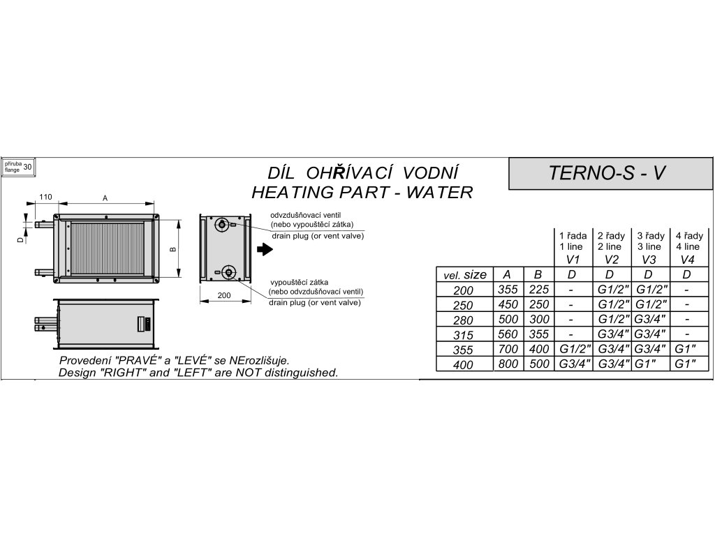 Zapojení vodních cest musí být do protiproudu! Nerozlišuje se provedení pravé či levé. Musí být vždy dodržen směr proudění vzduchu dle směrového štítku na ohřívači a vstup a výstup vody dle štítků.