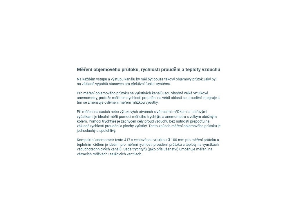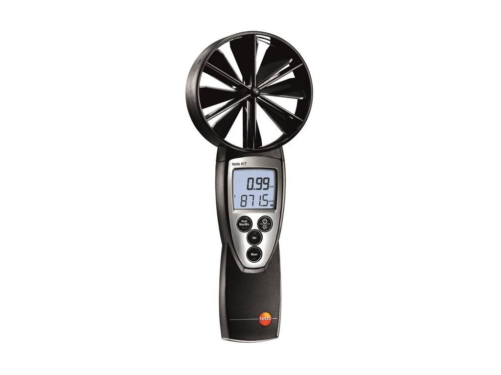 Testo 417 je kompaktní anemometr s integrovanou vrtulkovou sondou proudění / teploty. Měří rychlost proudění, objemový průtok a teplotu. Díky integrovanému měření pomocí vrtulky o průměru 100 mm se ideálně hodí pro měření na vzduchových vyústkách a vpustích. Směr proudění, tzn. sací nebo vyfukující proudění, je zobrazen na displeji. Souprava trychtýřů mimo jiné umožňuje měření na ventilačních mřížkách a talířových ventilech. Objemový průtok je zobrazován přímo na displeji. Pro výpočet objemového průtoku je možné v přístroji Testo 417 komfortně zadat plochu kanálu. Navíc lze přepnout na aktuálně měřenou hodnotu teploty. Výpočet bodové a časové střední hodnoty podává informaci o průměrném objemovém průtoku, rychlosti proudění a teplotě. Funkce Hold umožňuje podržení aktuální naměřené hodnoty na displeji, hodnoty min. / max. se rovněž zobrazí po stisknutí tlačítka.
