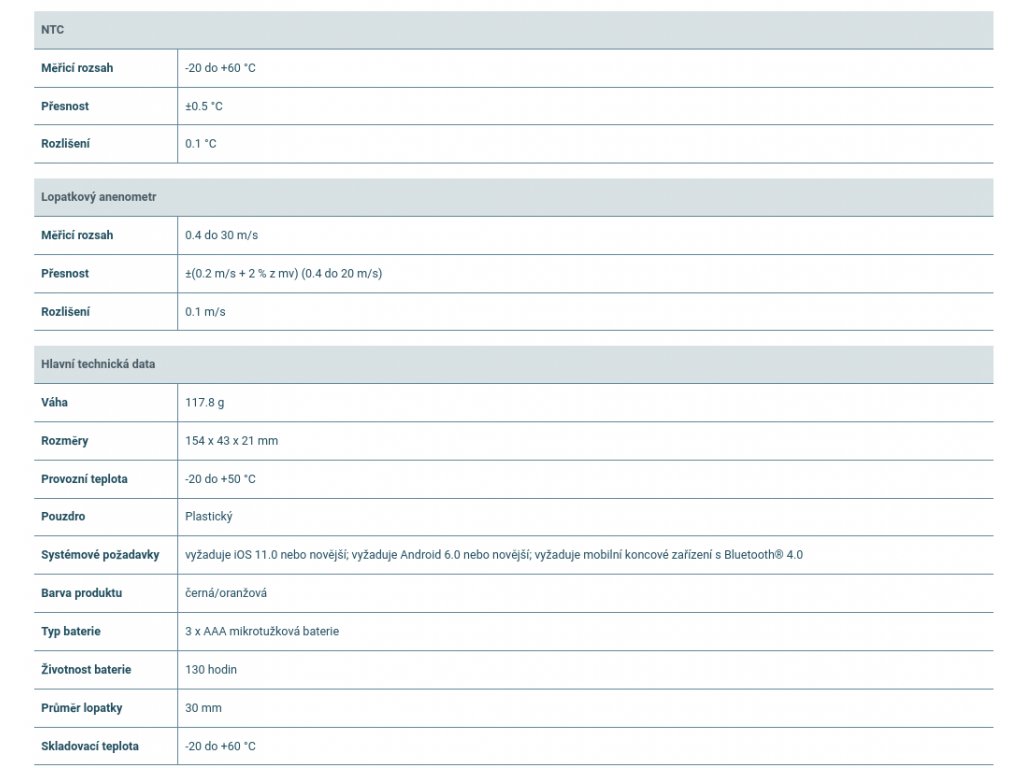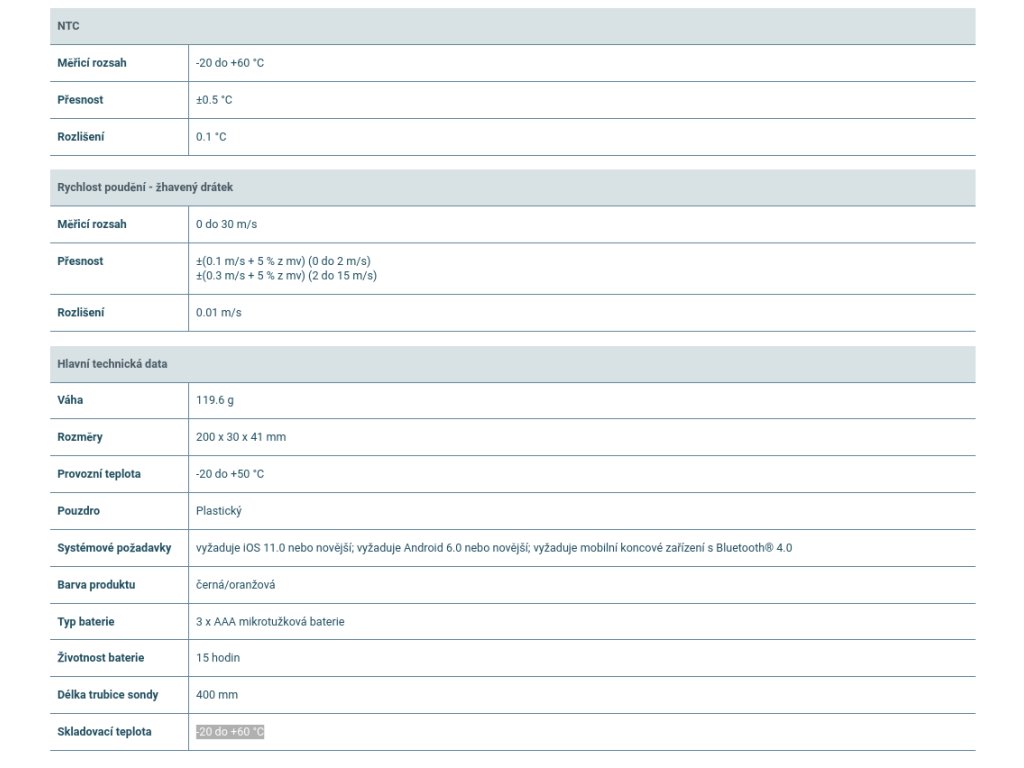 - 1 x testo 410i vrtulkový anemometr ovládaný chytrým telefonem, včetně ochranného krytu, baterií a výstupního protokolu z výroby* (V19970)