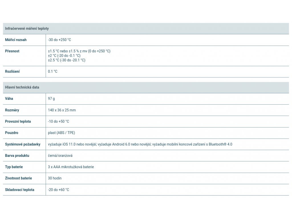 - 1 x testo 805i infračervený teploměr ovládaný chytrým telefonem, včetně baterií a výstupního protokolu z výroby* (V19972)