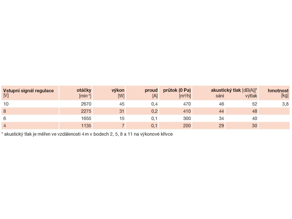EC motor s tepelnou ochranou proti přetížení. Ložiska kuličková. Krytí IP44, třída izolace B. Pracovní teplota –20 °C až +60 °C.