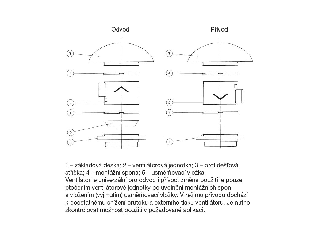 Ventilátor je univerzální pro odvod i přívod, změna použití je pouze otočením ventilátorové jednotky po uvolnění montážních spon a vložením (vyjmutím) usměrňovací vložky.