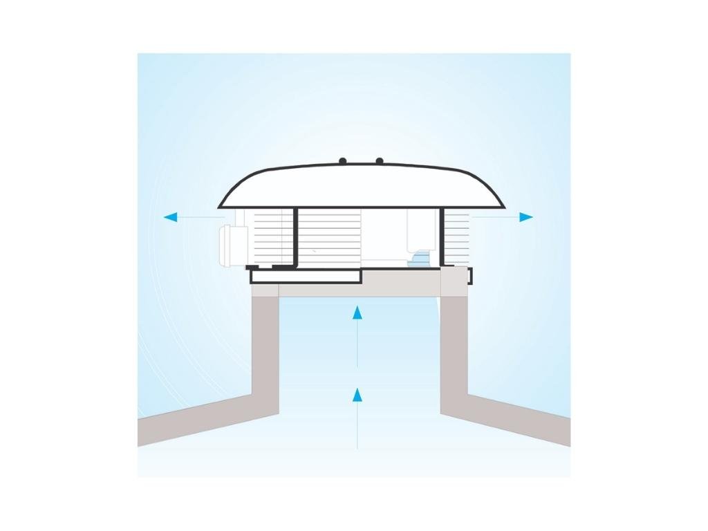 Střešní třífázový ventilátor Italského výrobce Vortice Torrette RF EU T 20 4P s horizontálním výfukem. Ventilátor je vhodný pro montáž na střechy obytných, komerčních a průmyslových budov. Určený pro odsávání částečně prašného vzduchu nebo kouře, neagresivní a nekorozivotvorné vzdušiny bez kyselin s maximální teplotou pro nepřetržitý provoz 60 °C. Torrette RF EU není vhodný pro odsávání vzduchu přímo z krbů nebo kotlů.