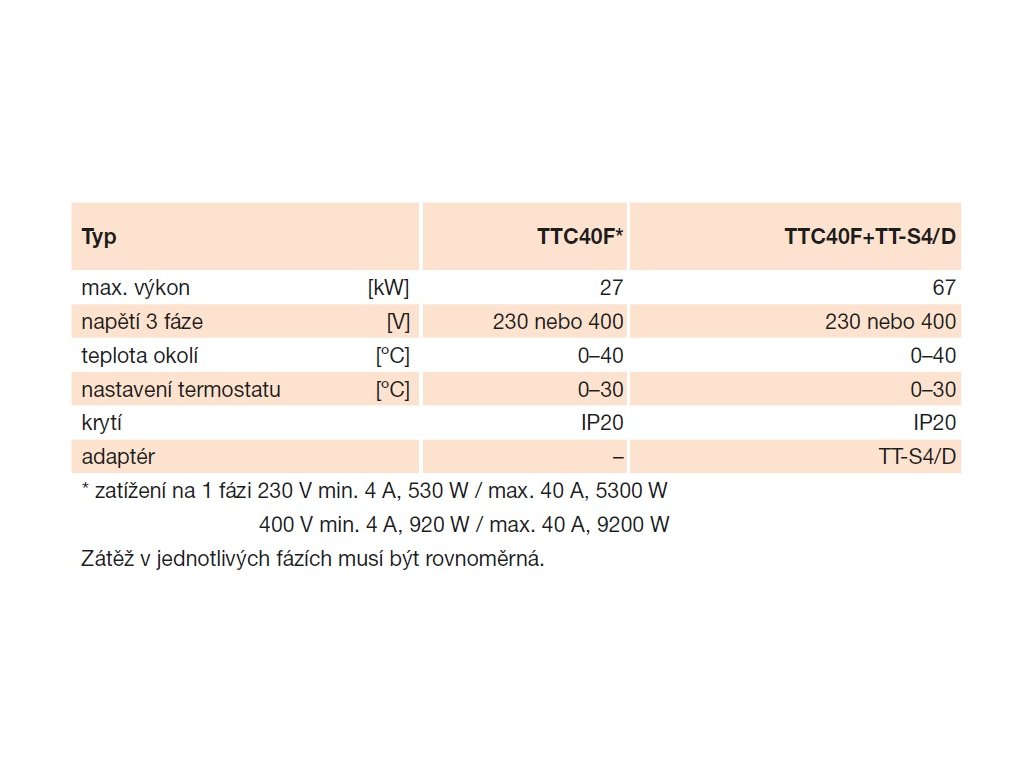 Proporcionální regulátor TTC40F je určen pro regulaci elektrických 3-fázových ohřívačů MBE a IBE do 27 kW. TTC40F lze řídit pomocí teplotních čidel nebo signálem 0–10 V, TTC40FX pouze signálem 0–10 V. Ve spojení s adaptérem TT-S4/D je určen pro regulaci až do 67 kW.