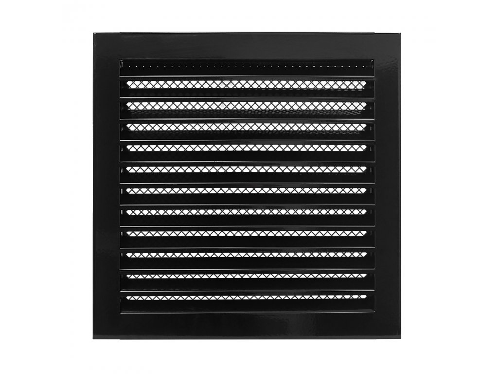 Ventilační mřížka - s přírubou 300x300 mm, barva černá, jako RAL9005, materiál pozink. ocel, kvalitní zpracování, s pevnou protidešťovou žaluzií, čtvercový tvar, předpokládané umístění (fasáda, zdivo - průmyslových i domácích budov), elegantní design, jemné síto proti ptactvu / hlodavcům, jednoduchá instalace, vysoce odolná konstrukce, rozměry 360×360 mm (Š×V), hmotnost 1,2 kg