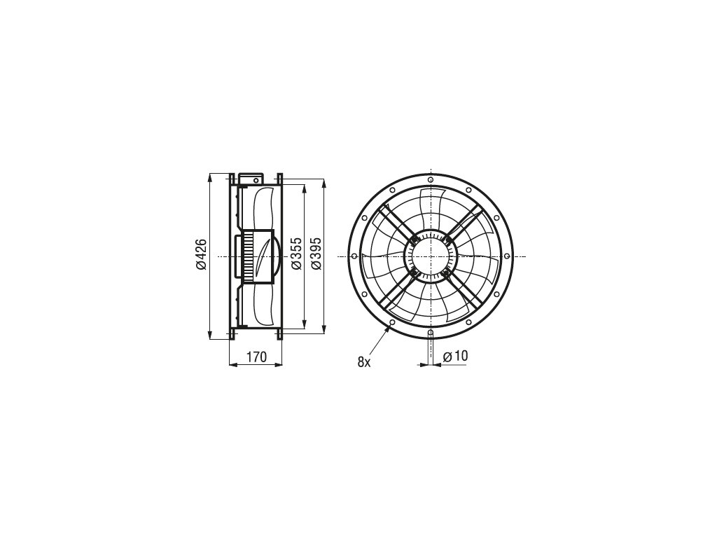 Oběžné kolo je z ocelového plechu do Průměr 355, vyšší průměry mají lopatky z Al slitiny, tvar „SICKLE“ je speciálně optimalizovaný z hlediska maximálního průtoku a tlaku při minimální hlučnosti. Oběžné kolo je nalisované přímo na motoru.
