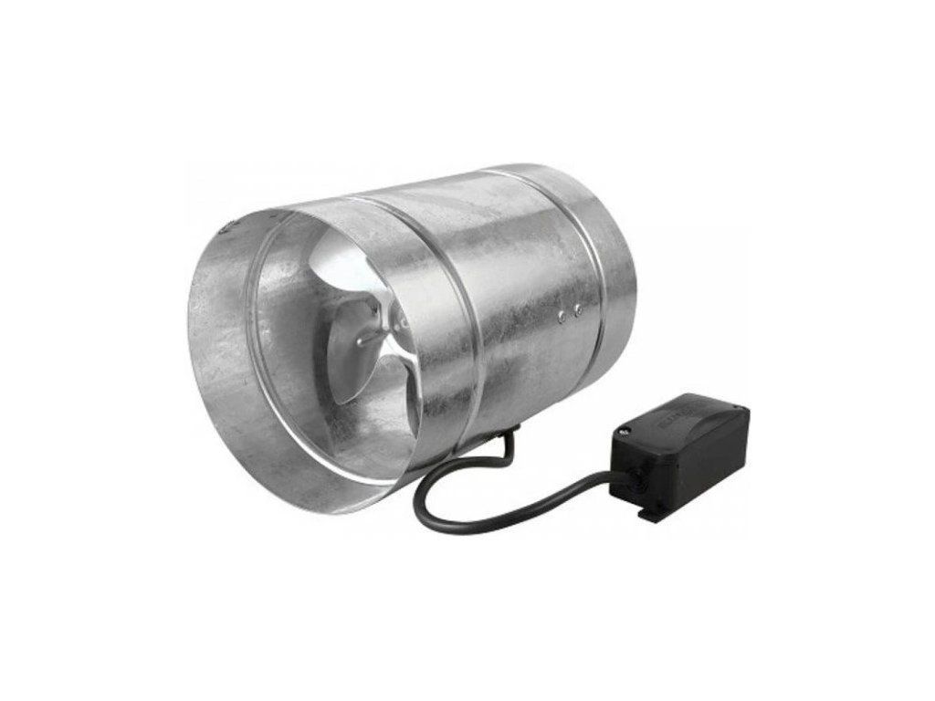 Ventilátor do potrubí - ⌀ 150 mm (průměr potrubí), axiální konstrukce, max. teplota 40 °C, kluzná ložiska, průtok vzduchu 180 / 205 m3/h, příkon 36 / 26 W, krytí IP X4, konstrukce pozink. ocel, hlučnost 33 dB/A, proud 0,19 / 0,17 A, otáčky 1432 / 1590 min, využití (např. rodinné domky, koupelny, obchody, pěstírny, bary, kavárny, restaurace i další komerční / průmyslové budovy), rozměry 220 × 183 mm (Š×V), hmotnost 1,8 kg