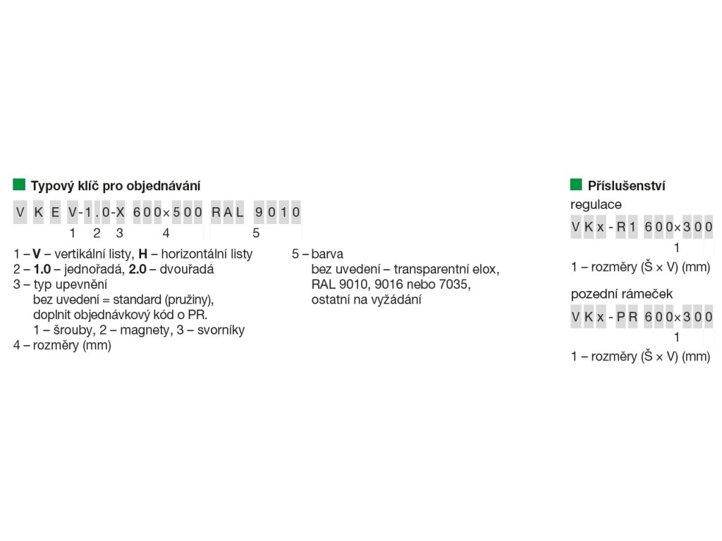 Obdélníkové vyústky komfortní (včetně listů) jsou vyrobeny z Al profilu opatřeného transparentním eloxem. Vypalovací barva v základních odstínech RAL za příplatek, ostatní barevné varianty na vyžádání.