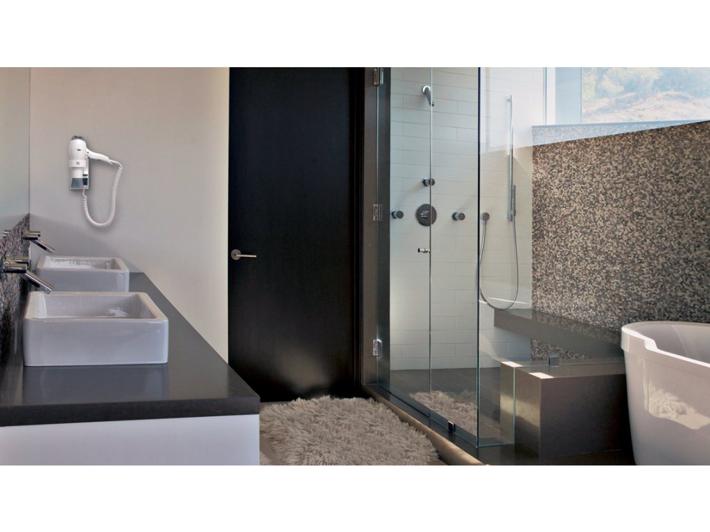 Nástěnný ruční vysoušeč vlasů (stěnový fén) Vort Fohn 1600 italského výrobce Vortice. Určený pro šatny sportovišť, bazénů, wellness center, hotelové pokoje i domácnosti.