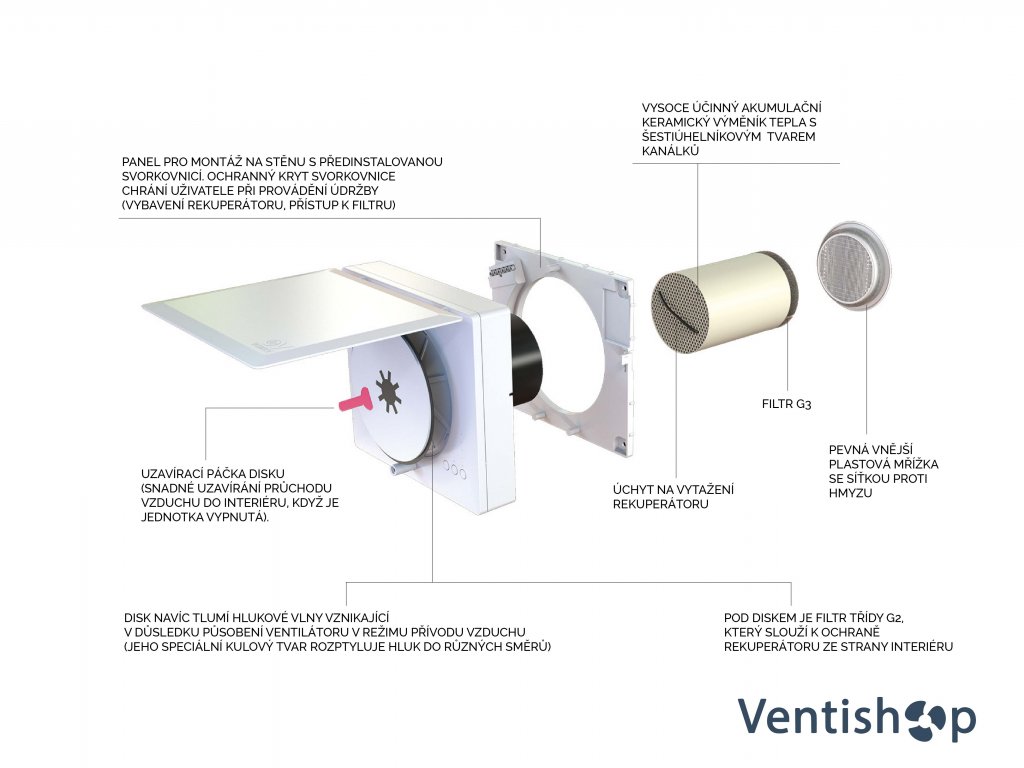 Vysoce účinný keramický výměník tepla s šestiúhelníkovým tvarem kanálků pro maximální tepelnou výměnu během zimního provozu. V teplých dnech je logika opačná, díky praidelnému přepínání směru otáčení ventilátoru, je výměník ohřívaný odsávaným vzduchem a následně přidá teplo do přiváděného čerstvého vzduchu. Cyklus přepínání je možné nastavit na 50/60/90 sekund.