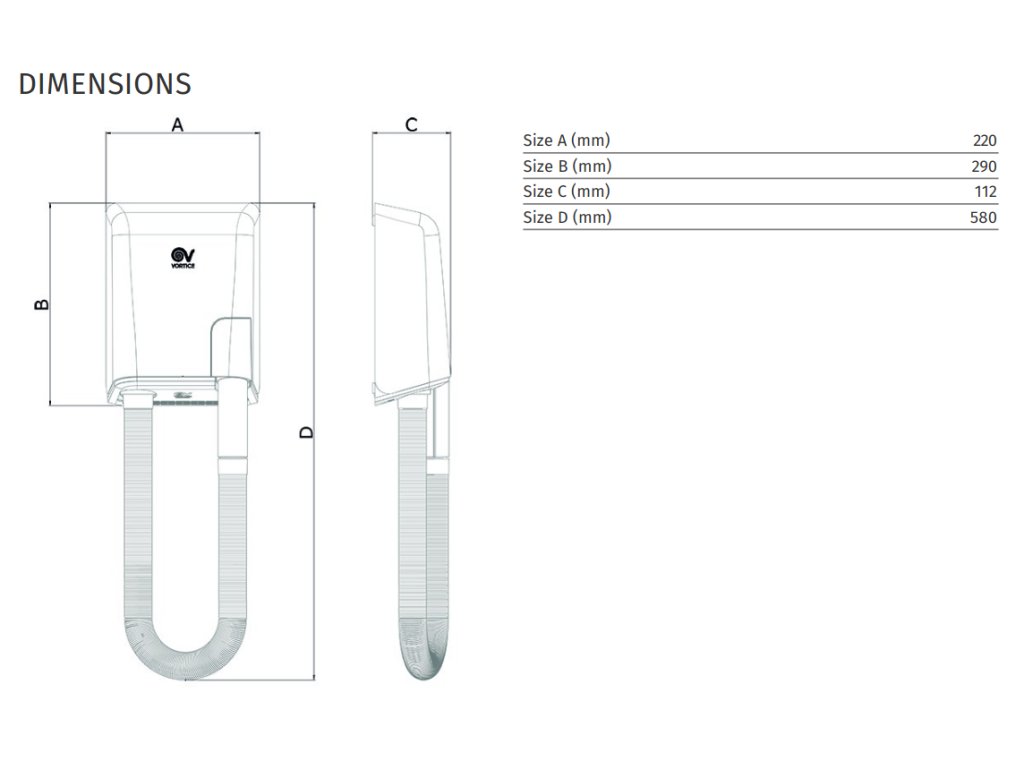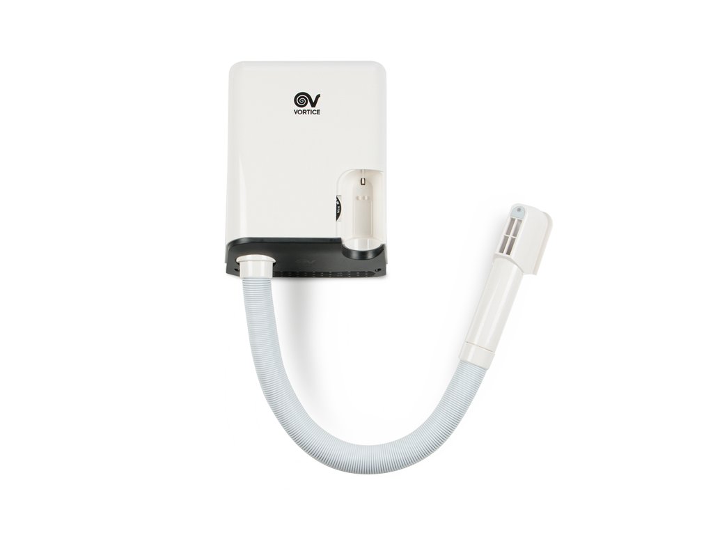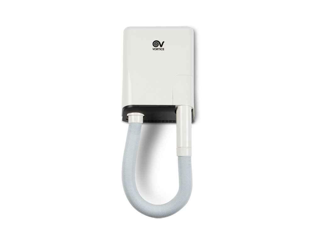 Výkonný vysoušeč vlasů (700 W, až 14 m/s) s flexibilní hadicí. Vhodný do šaten bazénů, wellness, posiloven, hotelů od renomovaného italského výrobce Vortice. Spotřebič se automaticky zapne, když se držadlo vyjme z přístroje a sám se vypne, když se držadlo umístí zpět na své místo. Nebo se případně vypne po 12 minutách nepřetržitého provozu.