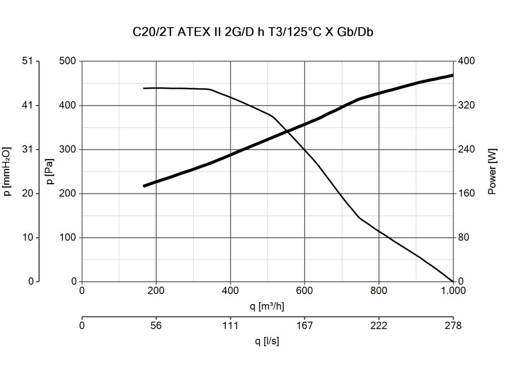 3-fázový radiální ventilátor Italského výrobce Vortice C ATEX s kódovým označením C20/2T ATEX II 2G/D H T3/125°C X GB/DB určený do prostorů, kde hrozí nebezpečí výbuchu plynů, nebo prachových částic. Ventilátor s přímým výfukem určený pro montáž do stěny, stropu nebo také do potrubí.