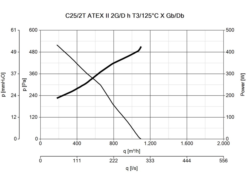 3-fázový radiální ventilátor Italského výrobce Vortice C ATEX s kódovým označením C25/2T ATEX II 2G/D H T3/125°C X GB/DB určený do prostorů, kde hrozí nebezpečí výbuchu plynů, nebo prachových částic. Ventilátor s přímým výfukem určený pro montáž do stěny, stropu nebo také do potrubí.